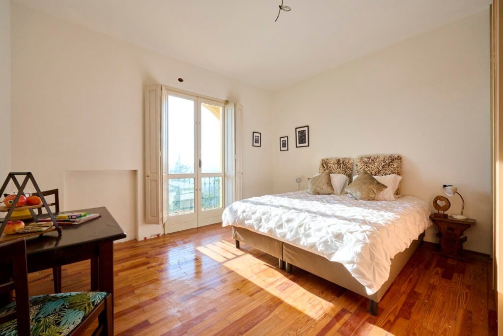 Deze kamer is een romantische hoekkamer op de eerste verdieping van de villa. Dankzij de ligging en het uitzicht voelt deze kamer licht en privé aan. De zachte kleuren en elegante afwerking maken dit de perfecte kamer voor koppels die op zoek zijn naar rust, charme en comfort.